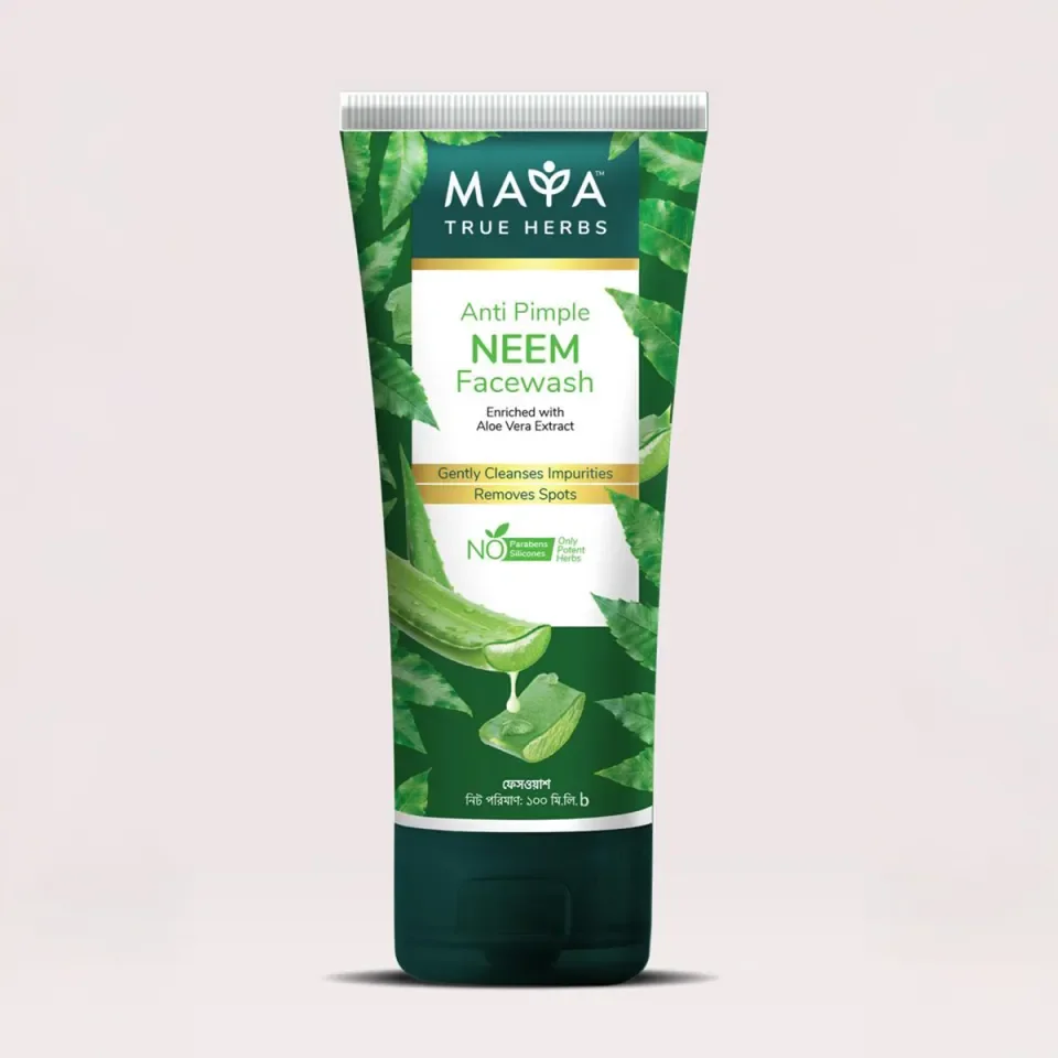 MAYA Anti-Pimple Neem Facewash is crafted from nature’s most potent purifiers, bringing together the power of neem and aloe vera for clear, refreshed skin. Sourced with care, this gentle yet effective formula is designed to combat pimples, reduce spots, and cleanse deep without stripping away the much-needed moisture. Infused with antibacterial neem and soothing aloe vera, it works to remove impurities, control excess oil, and maintain a healthy skin balance. Experience a natural, refreshing cleanse with every wash.